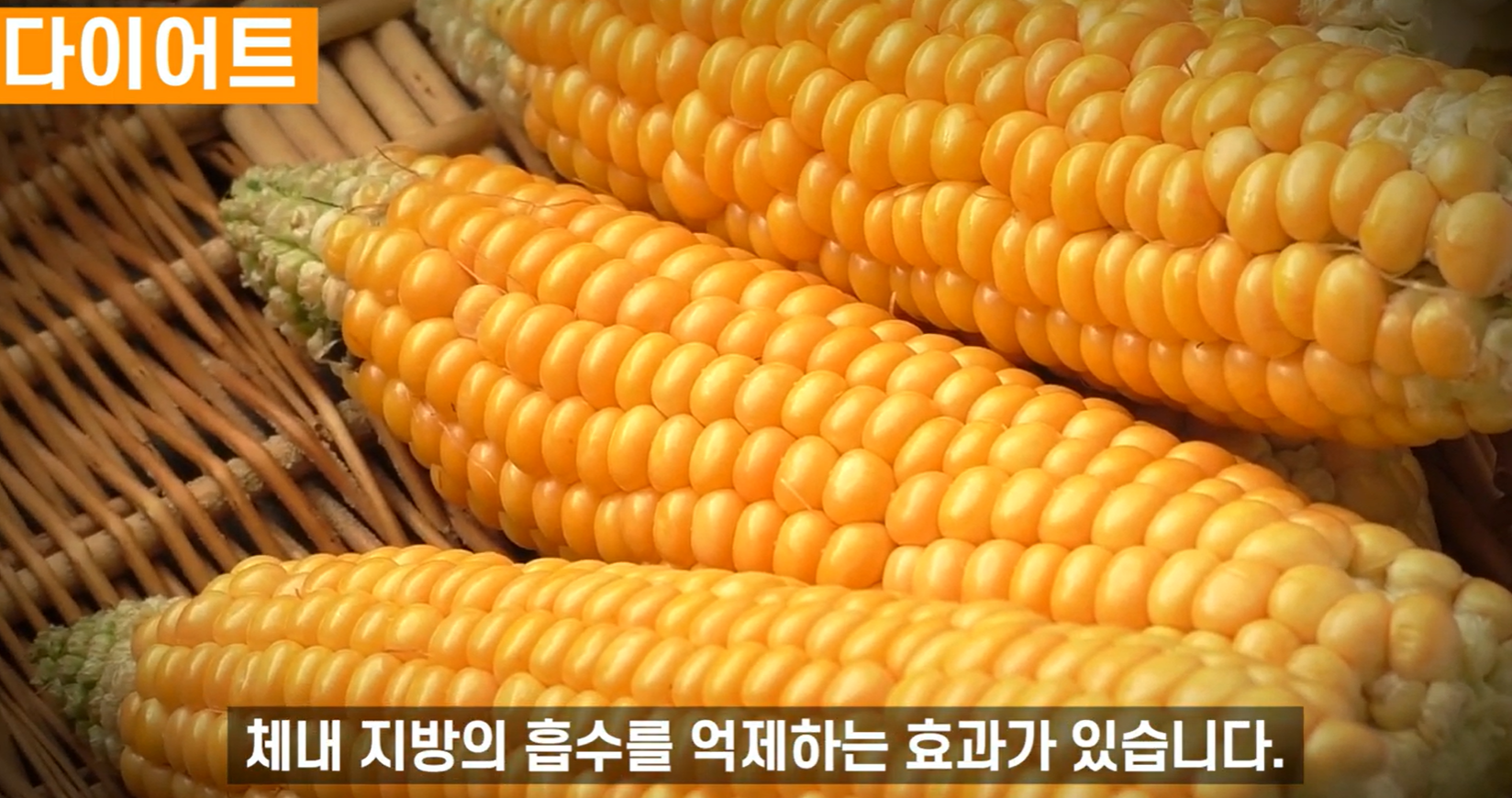 옥수수에는 100g에 4.73g의 식이섬유가 들어있는데, 이 식이섬유는 소화 및 흡수되지 않은 특성을 가지고 있어서 체내 지방의 흡수를 억제해 줍니다.