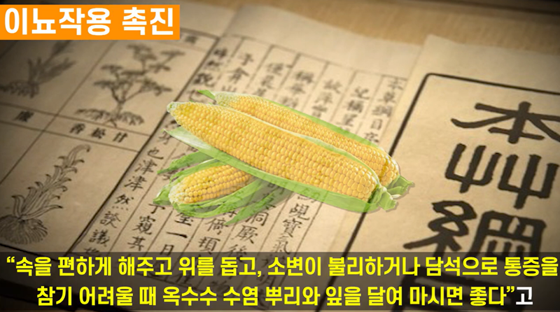 본초강목에는 옥수수가 속을 편하게 해주고 위를 도우며 옥수수 수염 뿌리와 잎을 달여서 마시면 담석 통증 등에 좋다고 기록되어 있습니다.