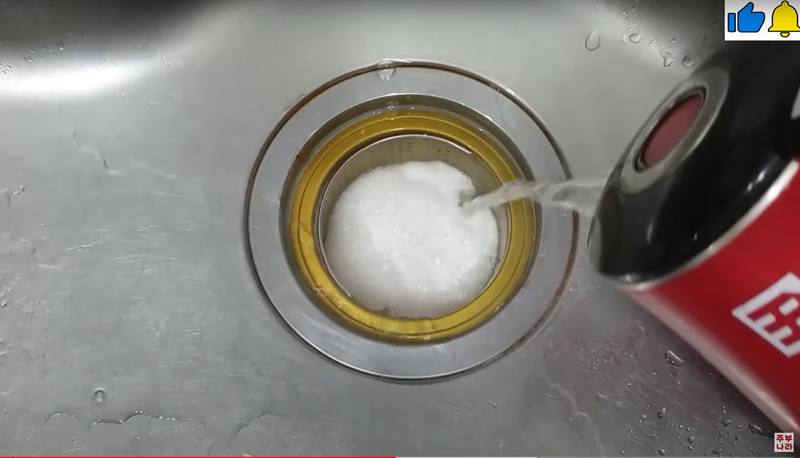 싱크대 배수구 내의 이물질을 제거한 후, 과탄산소다를 3분의 1정도 넣어 줍니다.