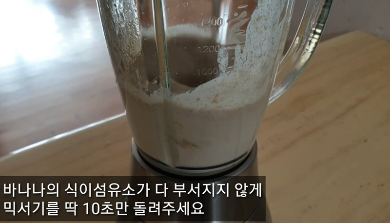 이후 바나나도 넣고 믹서기를 작동하면 되는데, 식이섬유소가 보존될 수 있도록 10초만 돌려 주면 완성됩니다.