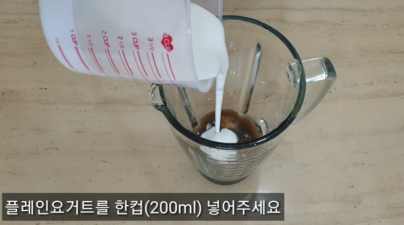 잘 섞어지면 믹서기에 부은 후 플레인요거트를 넣어 줍니다.