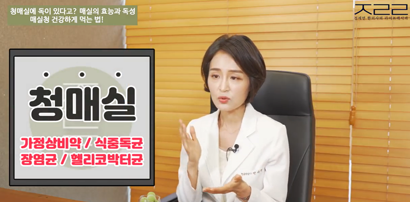또한, 가정상비약으로 식중독균, 장염균, 헬리코박터균까지 다스릴 수 있는데 황매실보다는 청매실의 효과가 더 큽니다.