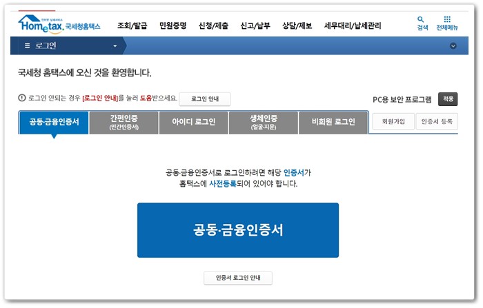 먼저 홈택스 사이트에 접속하고 로그인 버튼을 클릭합니다.