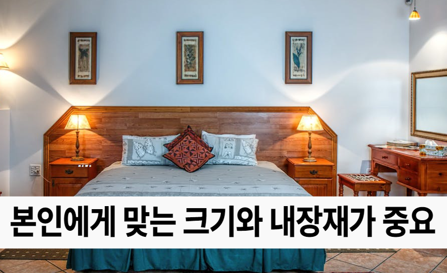 다음으로 두 번째 고려해야하는 사항은 매트리스의 내장재입니다. 가장 흔하게 사용하는 매트리스 중 하나인 스프링 매트리스는 딱딱한 침대를 좋아하는 사람이 사용하는 것이 좋습니다. 스프링 매트리스는 일정시간 사용하면 내부 스프링의 탄력이 줄어들어 평평했던 면이 조금 꺼질 수 있기 때문에 주기적으로 뒤집어 주는 것이 좋습니다.