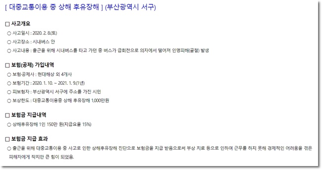 또한 시민안전보험은 지방자치단체가 관장하고 보험‧공제사가 운영하는 보험으로 보험료를 관할 지자체에서 부담하는 함으로써 일상생활 중 예상치 못한 사고 등을 당했을 경우 피해자가 일상으로 복귀 할 수 있도록 지원해주는 보장제도입니다.