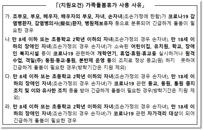 22년 1월 1일부터 12월 16일까지 아래의 사용 사유로 남녀고용평등법상 가족돌봄 휴가를 사용한 근로자가 대상자입니다.