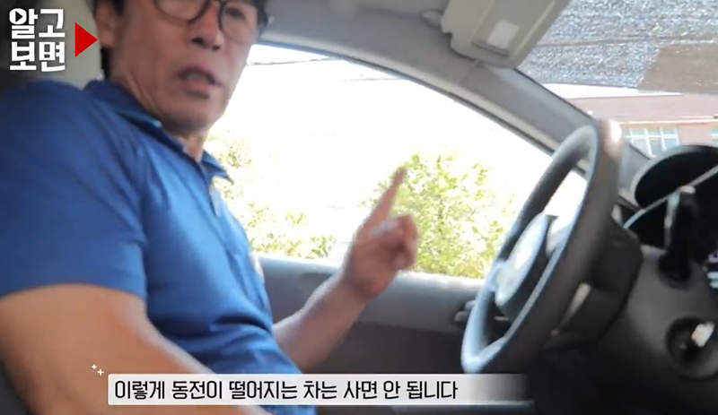 40년 넘게 중고차 판매 및 차량 정비를 해온 전문가의 중고차 확인 방법으로, 올린 동전이 떨어지지 않아야 정상적인 차량이라고 합니다.