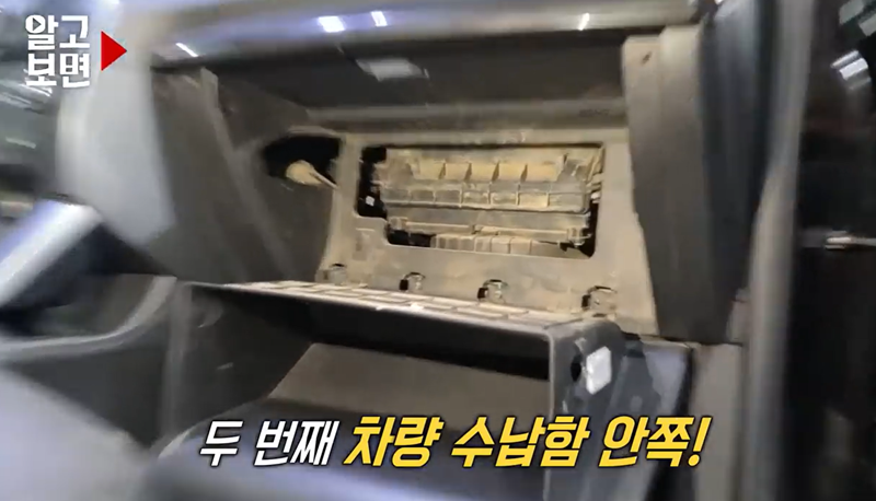 자동차의 수납함 안쪽도 침수차의 경우 흙먼지가 가득차 있는 걸 확인할 수 있습니다.